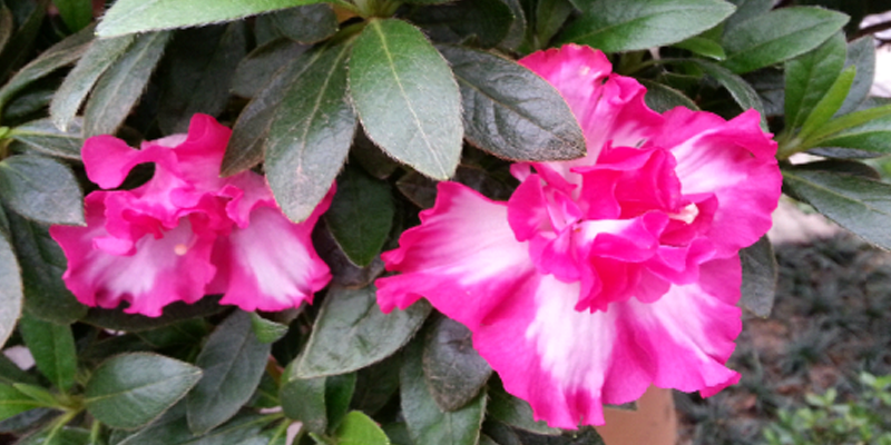 美国双喜叶椭圆形,淡绿色,较小;花色白色玫瑰红边,花型中型,11月下旬开花至翌年1月,花期3个月左右。双喜杜鹃白色淡雅,红边娇艳两种颜色完美得到融合到一起看上去别有一番滋味。